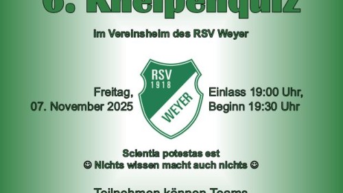 Das 6. Kneipenquiz des RSV Weyer findet am Freitag, 07.11.2025 im Vereinsheim des RSV statt.