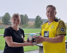 Nicole Schneider übergibt den 'Staffelstab' in Form eines Balles an Ralf Grohmann